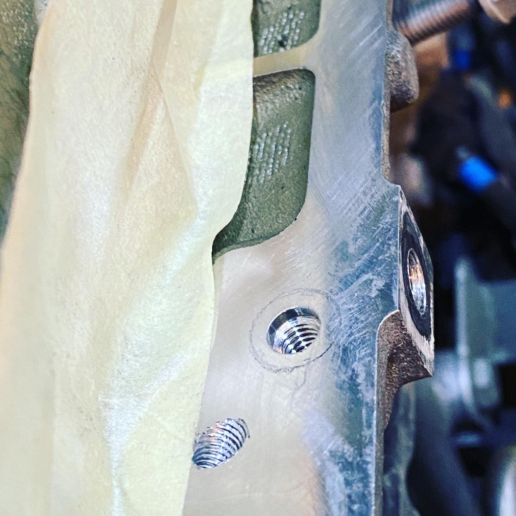 Nach dem Wallnussstrahlen der Einlassventile habe ich den Einbau des externen PCV-Systems in Angriff genommen. Als Erstes habe ich die Kanäle im Zylinderkopf verschlossen, durch welche die Blowbygase vor die Einlassventile geleitet werden. Dazu habe ich die originalen Kanäle im Zylinderkopf leicht aufgebohrt sowie ein M5-Gewinde geschnitten, um die Kanäle anschliessend mit M5 Madenschrauben zu verschliessen. Ich habe ein Kernloch von 4.2mm gebohrt und M5 Madenschrauben mit einer Steigung von 0.8mm verwendet. Zusätzlich habe ich das Ganze mit hitzebeständiger Dichtpaste abgedichtet. Anbei einige Bilder dazu: