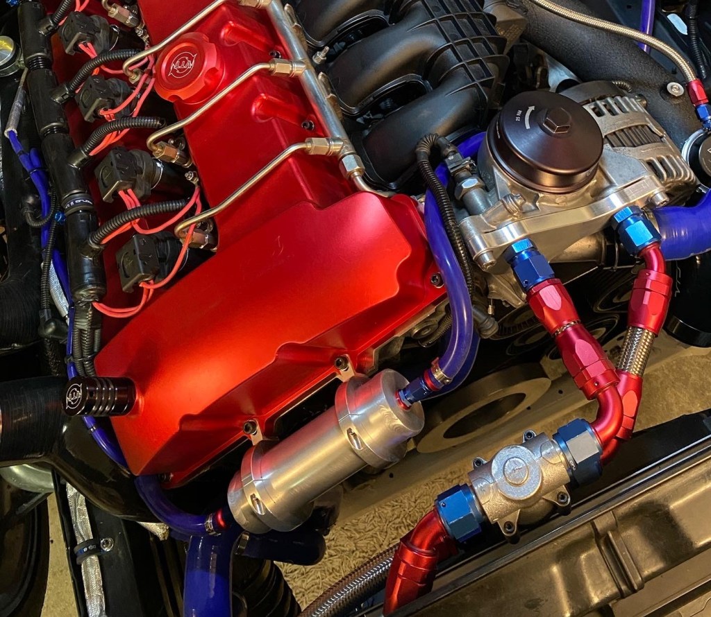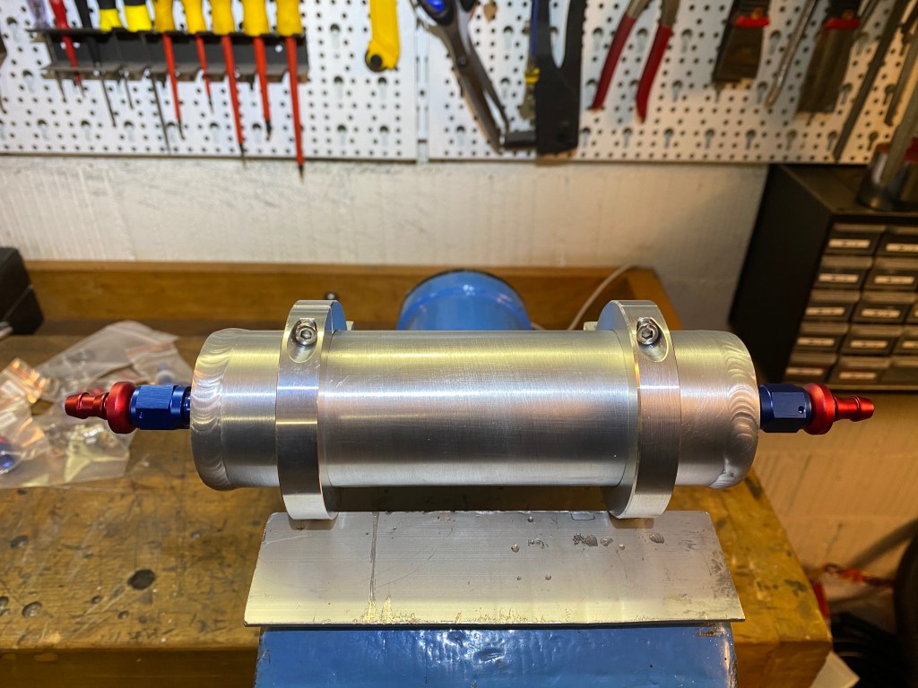 Der N54-Motor hat original zwei Unterdruckspeicher verbaut, die – wie der Name schon sagt – den Unterdruck speichern. So soll sichergestellt werden, dass in allen Fahrsituationen genügend Unterdruck vorhanden ist, um die Wastegates der Turbos anzusteuern. Aufgrund der neuen Position meines Ansaugsystems mussten die originalen Unterdruckspeicher weichen. Es gibt viele N54-Fahrer, welche die Unterdruckspeicher komplett entfernen und keinerlei Probleme haben. Ich wollte aber auf Nummer sicher gehen und habe mir deshalb einen eigenen Unterdruckspeicher gebaut. Bei Turbomotoren herrscht nur im Leerlauf ein Unterdruck, weshalb beim N54 eine zusätzliche Unterdruckpumpe permanent Unterdruck erzeugt. Dieser Unterdruck wird benötigt für die Wastegate-Steuerung sowie den Bremskraftverstärker. Anhand des verbauten Unterdruckspeichers möchte ich vermeiden, dass z.B. nach einem harten Bremsmanöver nicht genügend Unterdruck vorhanden ist, um die Wastegates zu schliessen und somit der Leistungsaufbau verzögert wird.