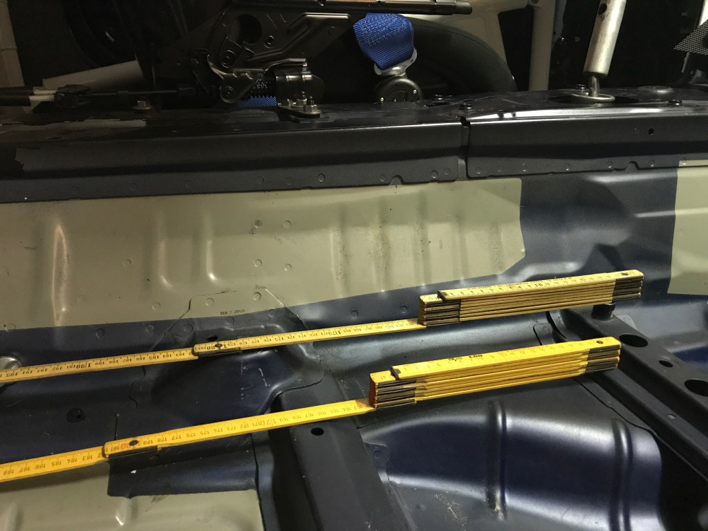 Als Nächstes habe ich zur Verstärkung 3mm Edelstahl Grund- und Gegenplatten verbaut (eingeklebt mit Karosseriekleber). Das Material ist extrem hart, hatte sogar mit dem Cobalt beschichteten Bohrer mühe die Löcher zu bohren. Auf dem Bild ist zu sehen, dass ich die Sitzposition so weit wie möglich in der Mitte des Fahrzeugs gewählt habe.