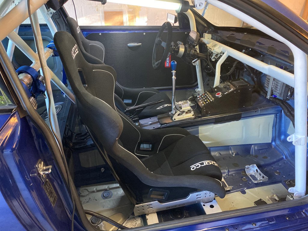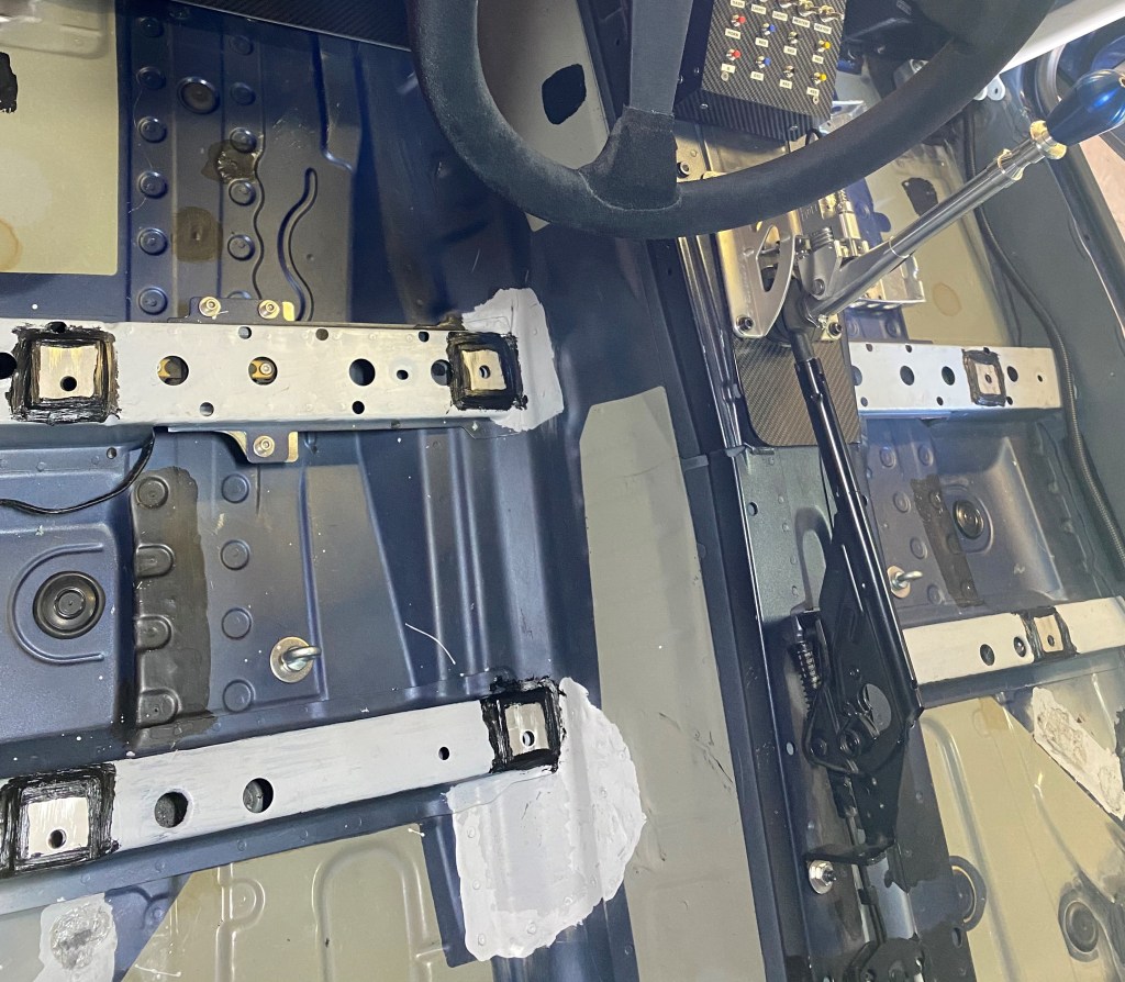 Die Sitze wurden anschliessen ohne Sitzschienen (keine Sitzverstellung mehr möglich) direkt anhand der Sparco Aluminium Sitzkonsolen auf den Boden verschraubt. So konnte ich einerseits die Sitzschienen sowie die Adapterplatten weglassen und andererseits ist die Konstruktion so viel stabiler (die Sitzschienen haben immer ein leichtes Spiel). Verschraubt habe ich das Ganze mit M10 Schrauben der Festigkeitsklasse 10.9.