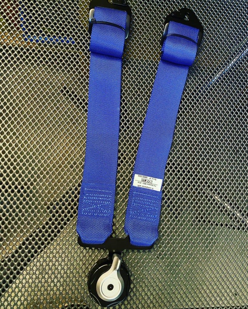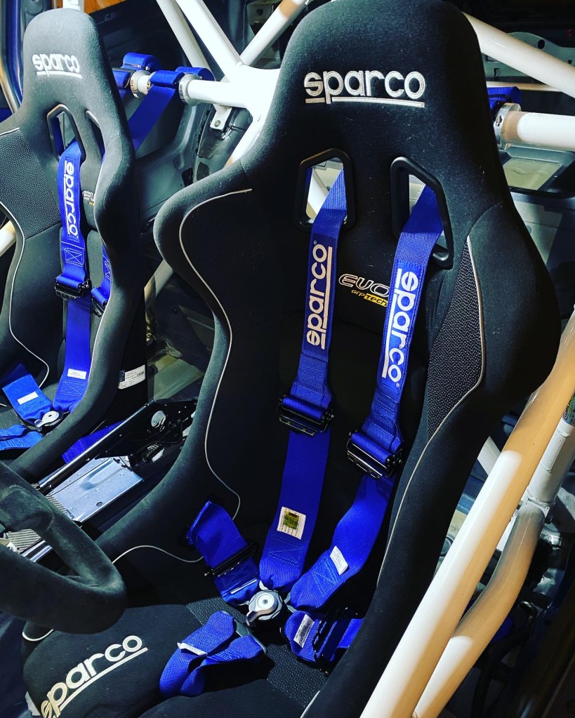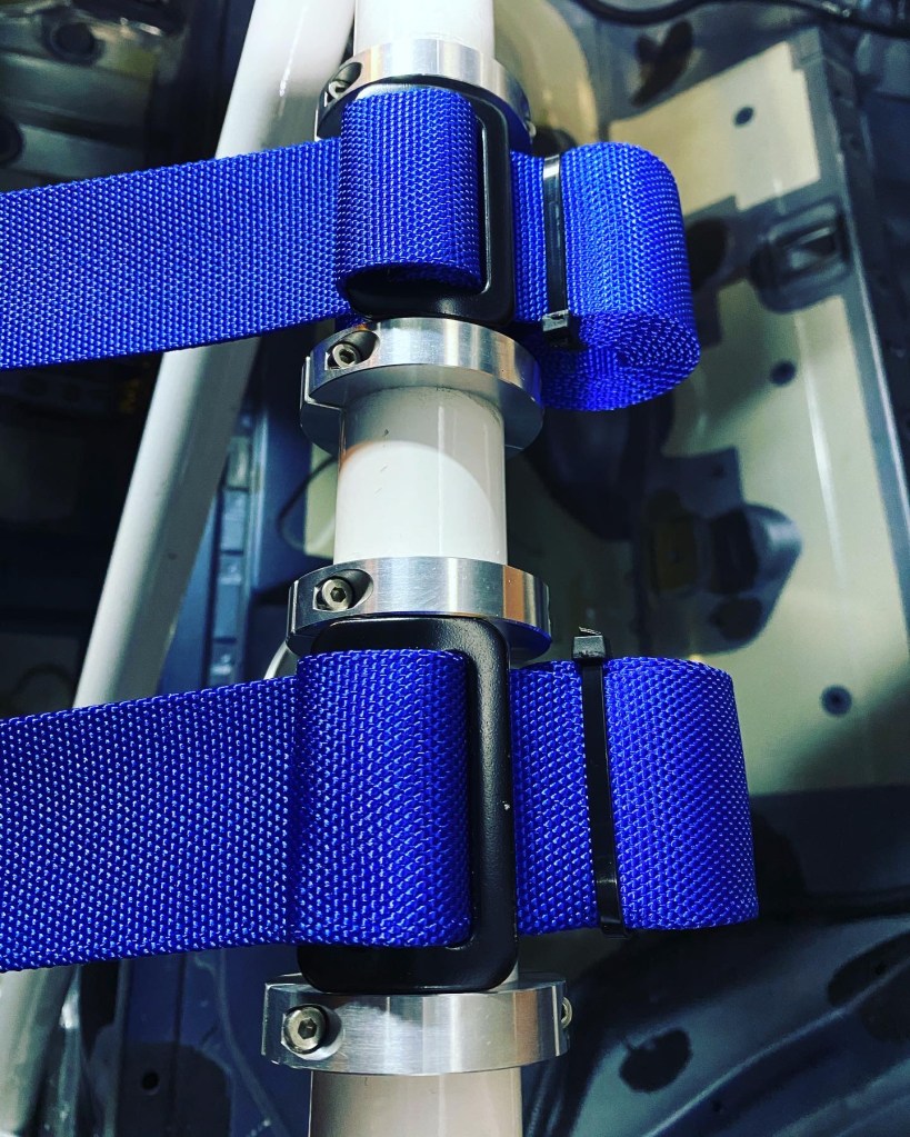 Da ich mein Fahrzeug nur noch auf der Rennstrecke nutze, habe ich die Schroth Profi II ASM Gurte mit ECE-Genehmigung durch reine Renngurte von Sparco ersetzt. Die Gurte verfügen über Versteller und ein Gurtschloss aus Aluminium. Für den Fahrer habe ich den Schultergurt in 2 Zoll Breite gewählt, damit dieser mit dem FHR-System (HANS) kompatibel ist (Schultergurt Beifahrer in 3 Zoll Breite). Für die korrekte Positionierung der Schultergurte (abhängig von Breite des HANS-Systems und Entfernung zwischen Befestigung der Schultergurte und HANS-System) habe ich Rohrschellen aus Aluminium an der Gurtstrebe des Käfigs montiert. So können die Schultergurte nicht verrutschen und bleiben in der für das HANS-System vorgeschriebenen Position.