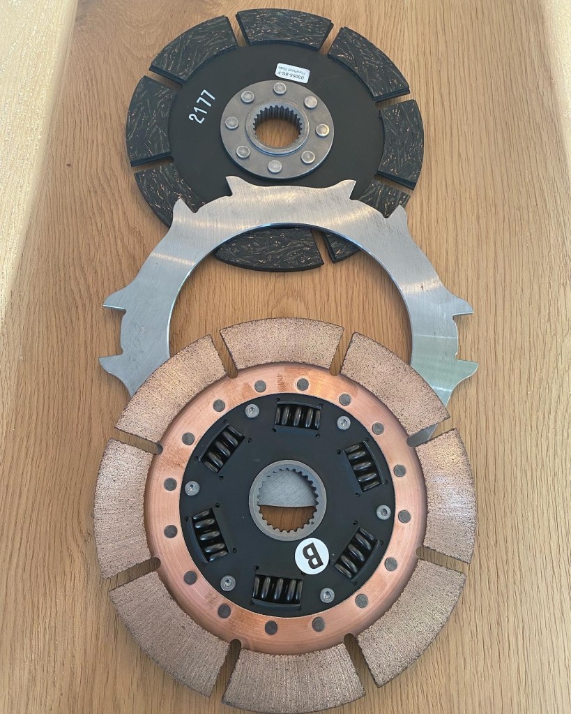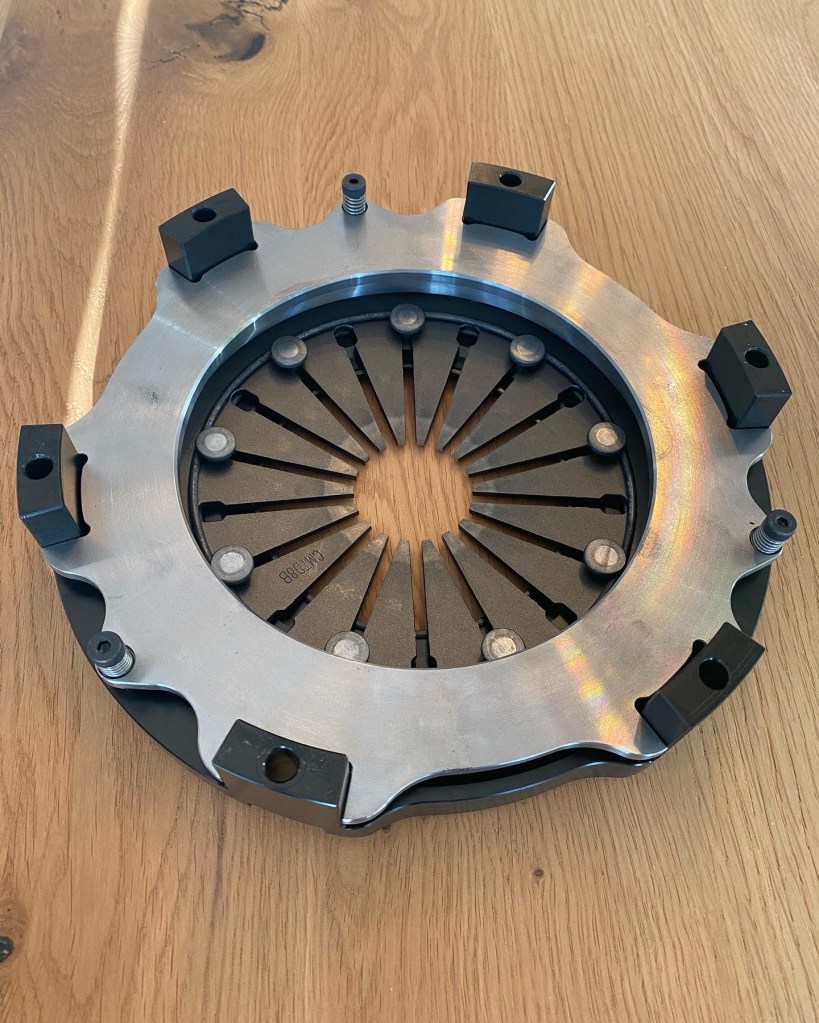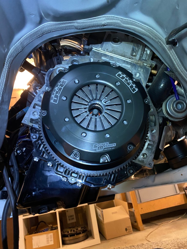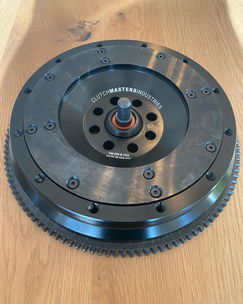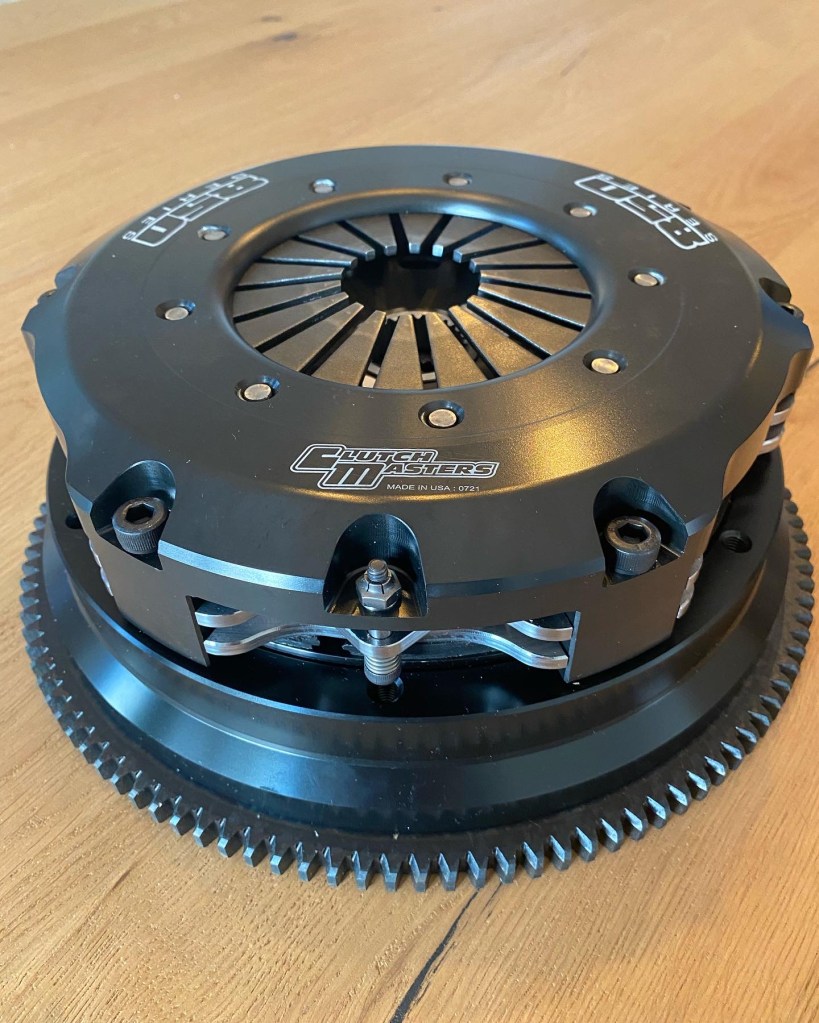 Die originale Kupplung ist bei knapp 700Nm Drehmoment an ihr Limit gestossen. Auf dem Leistungsprüfstand hatte die Kupplung leichten Schlupf. Deshalb wollte ich ein neues Kupplungspaket inkl. Schwungrad, das über genügend Leistungsreserven verfügt und zudem leichter ist als das originale Kupplungspaket. Die Clutch Masters FX850 verfügt über ein Aluminium Schwungrad (mit Stahlreibscheiben-Einsatz) sowie einer sintermetall Reibscheibe (gefedert) und einer organischen Reibscheibe (ungefedert). Das gesamte Kupplungspaket inkl. Schwungrad ist insgesamt nur rund 10kg schwer (original ca. 21kg).