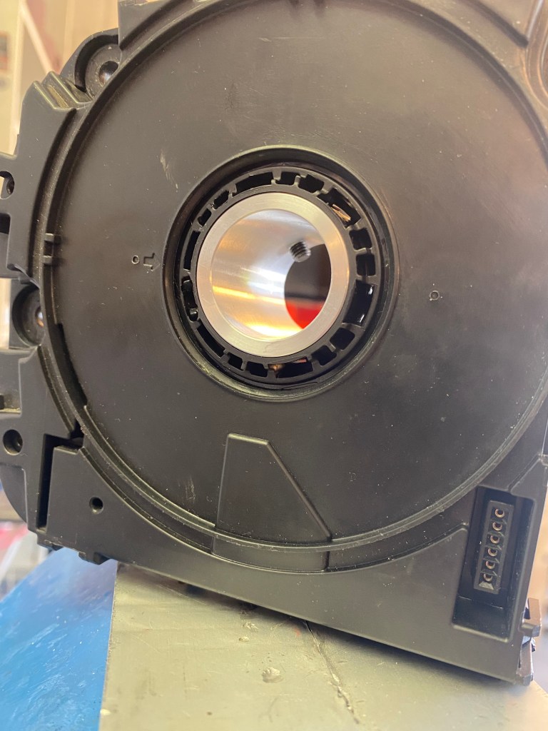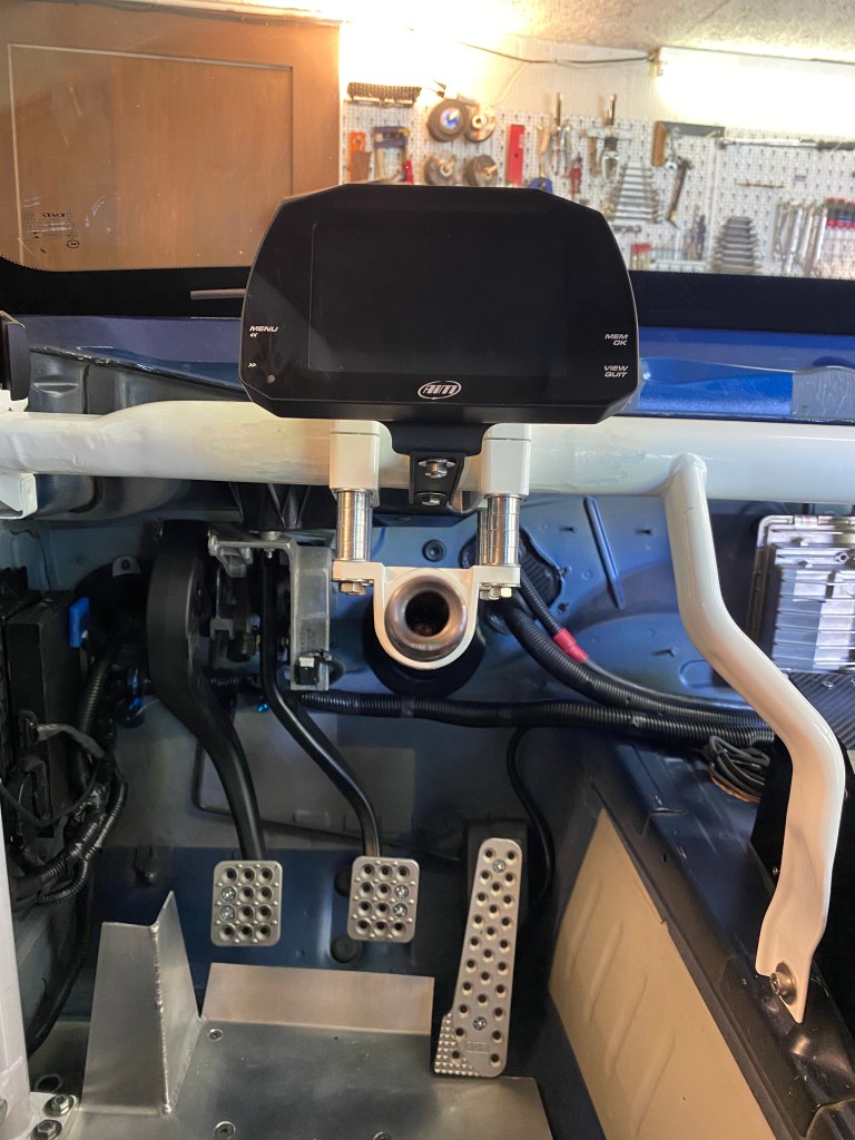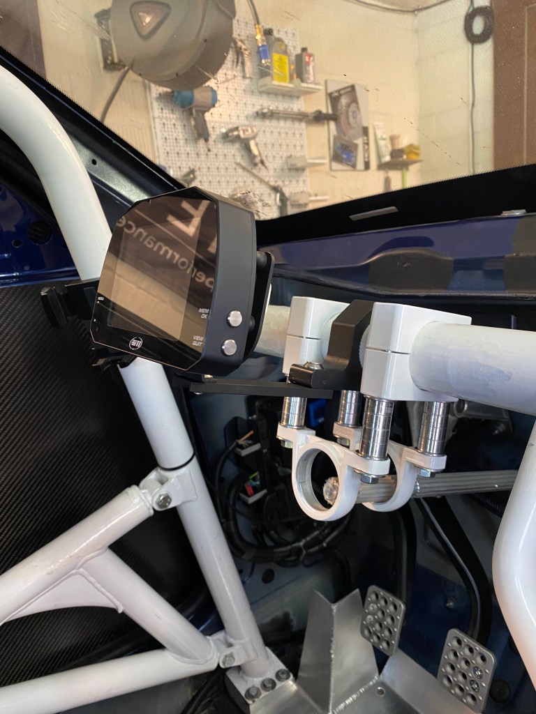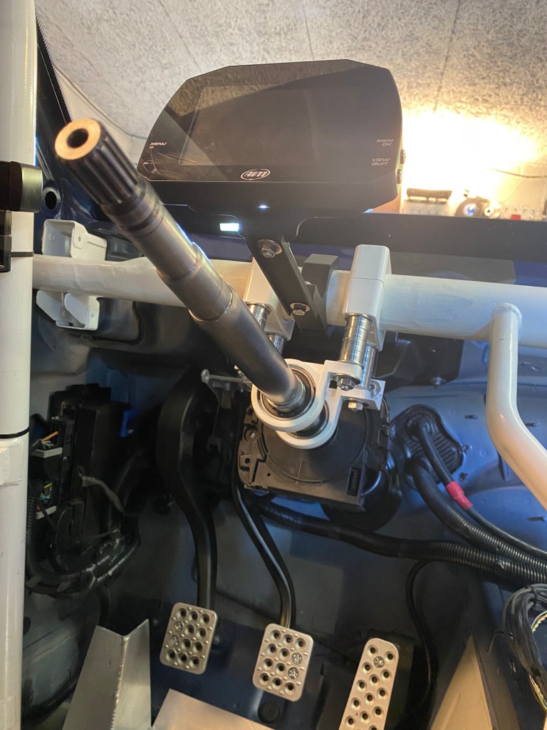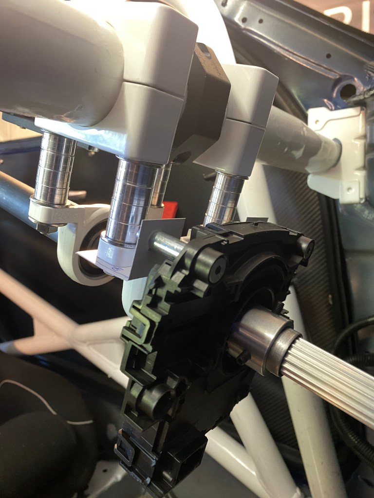 5. In einem fünften Schritt habe ich den Lenkwinkelsensor neu positioniert. Normalerweise sitzt dieser direkt hinter dem Lenkrad. Neu habe ich den Lenkwinkelsensor weiter weg vom Lenkrad positioniert, hinter dem Querträger bzw. hinter der Befestigung der Lenksäule. Dazu musste ich einen Adapter drehen lassen, der beim Lenkwinkelsensor eingeklebt wurde und auf der Lenksäule anhand von Madenschrauben befestigt und positionniert werden kann. Der Lenkwinkelsensor selber wird anhand von Aluprofilen direkt mit den Stehlagern verschraubt (in den Bildern unten sind noch die Prototypen der Aluprofile in Karton zu sehen).