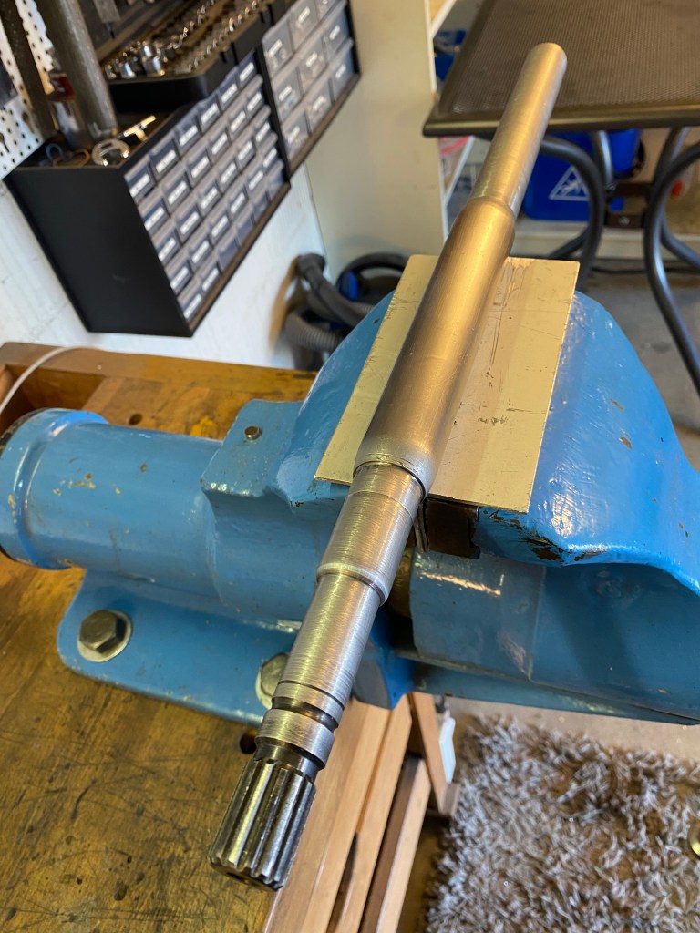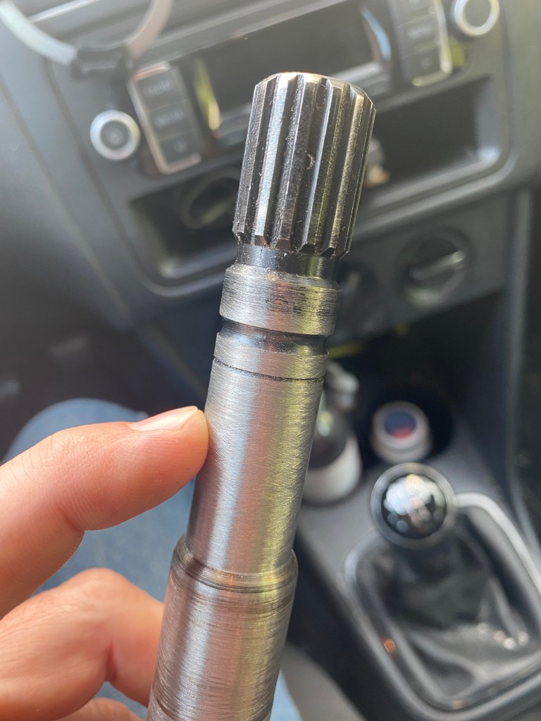 Die originale zweiteilige Lenksäule verfügt über zwei wesentliche Sicherheitsmerkmale, die ich unbedingt beibehalten wollte. Erstens kann im Falle eines Unfalls der Teil der Lenksäule mit Aussenverzahnung in den Teil der Lenksäule mit Innenverzahnung „eintauchen“. Dadurch soll verhindert werden, dass bei einem Unfall die Lenksäule den Fahrer durchbohrt. Zudem verfügt die Lenksäule mit Aussenverzahnung über eine Sollbruchstelle (ein mit Aluminium ummantelter Gummikern). Bei einem heftigen Crash soll die Lenksäule an dieser Stelle brechen und nicht weiter in den Innenraum gedrückt werden.