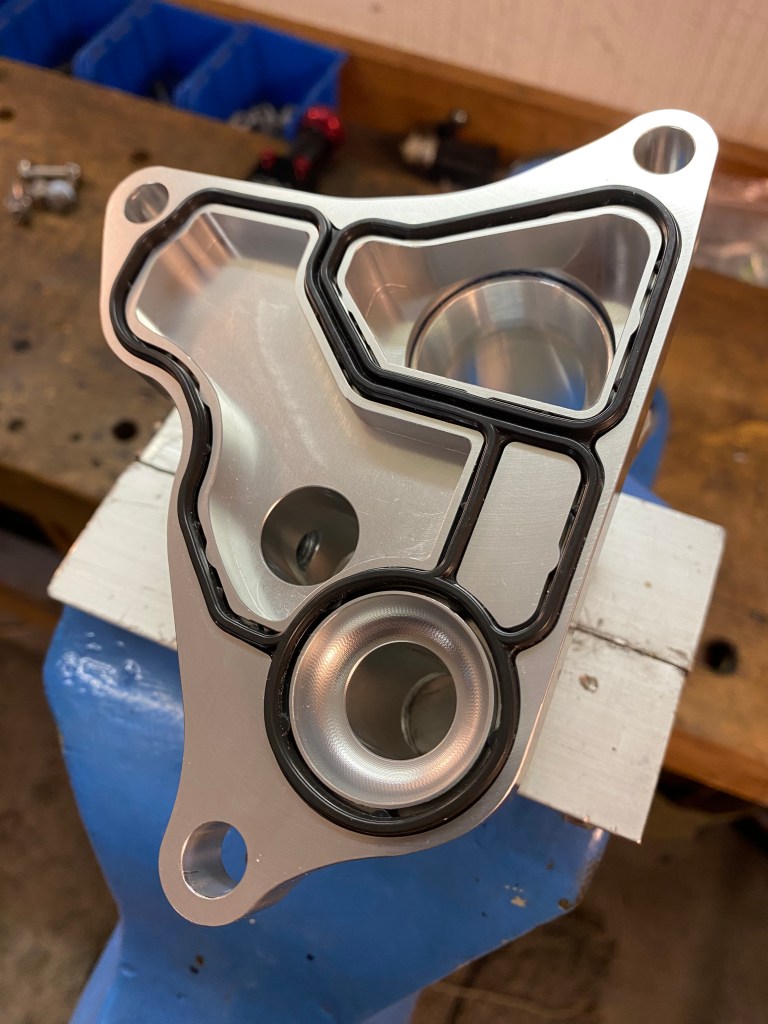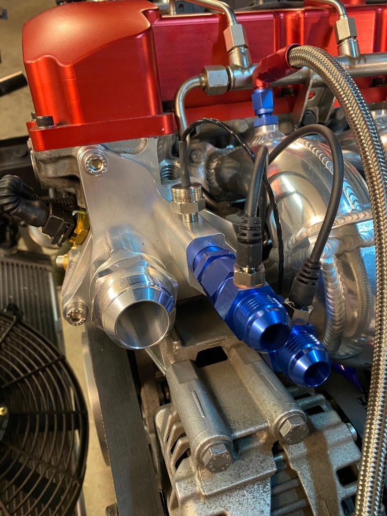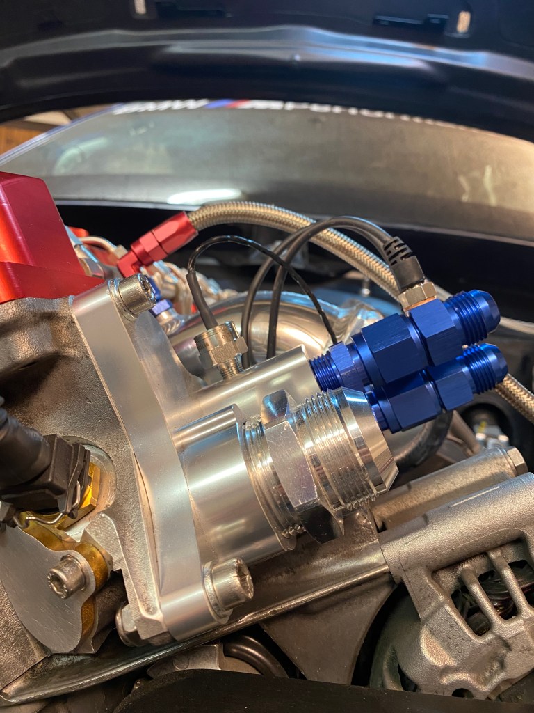Für mehr Flexibilität bzgl. Sensoren habe ich das originale Thermostatgehäuse komplett entfernt und durch einen Adapter von Navardi Tuned ersetzt. Der Adapter wird mit der originalen Dichtung verbaut und verfügt über die folgenden Anschlüsse: