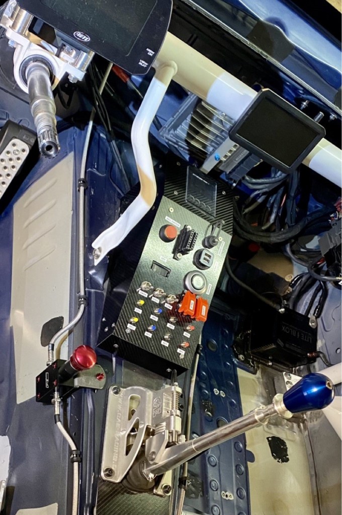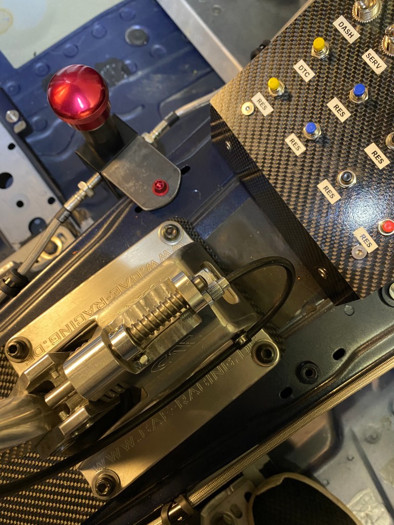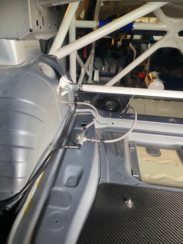 Die Bremsleitungen habe ich neu durch den Innenraum geführt, um die hydraulische Handbremse nahe beim Fahrer positionieren zu können. Zudem habe ich alle Bremsleitungen durch Stahlflexleitungen von Probrake ersetzt. Die Stahlflexleitungen von Probrake haben gleich wie Stahl-Bremsleitungen (auch über sehr grosse Distanzen) 0.0 Volumens-Ausdehnung. Des Weiteren habe ich das Fussraummodul (Steuergerät für das Licht) komplett ausgebaut und den Bremslichtschalter durch einen hydraulischen Bremslichtschalter ersetzt.