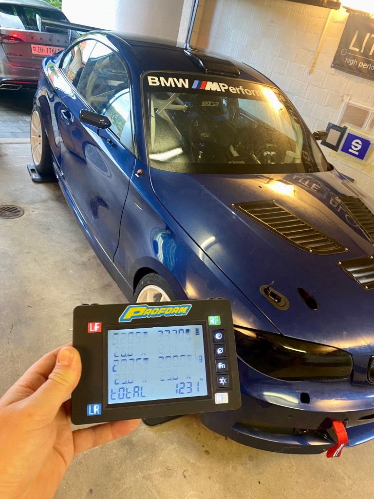 Anmerkung: Ich weise hier bewusst keine Gewichtsverteilung aus, da der Garagenboden uneben ist und somit die Radlasten nicht sauber ermittelt werden konnten. Es ging mir lediglich um die Ermittlung des Gesamtgewichts (Cross-Gewichte werden im Rahmen des Fahrwerk-Set-Ups eingestellt).