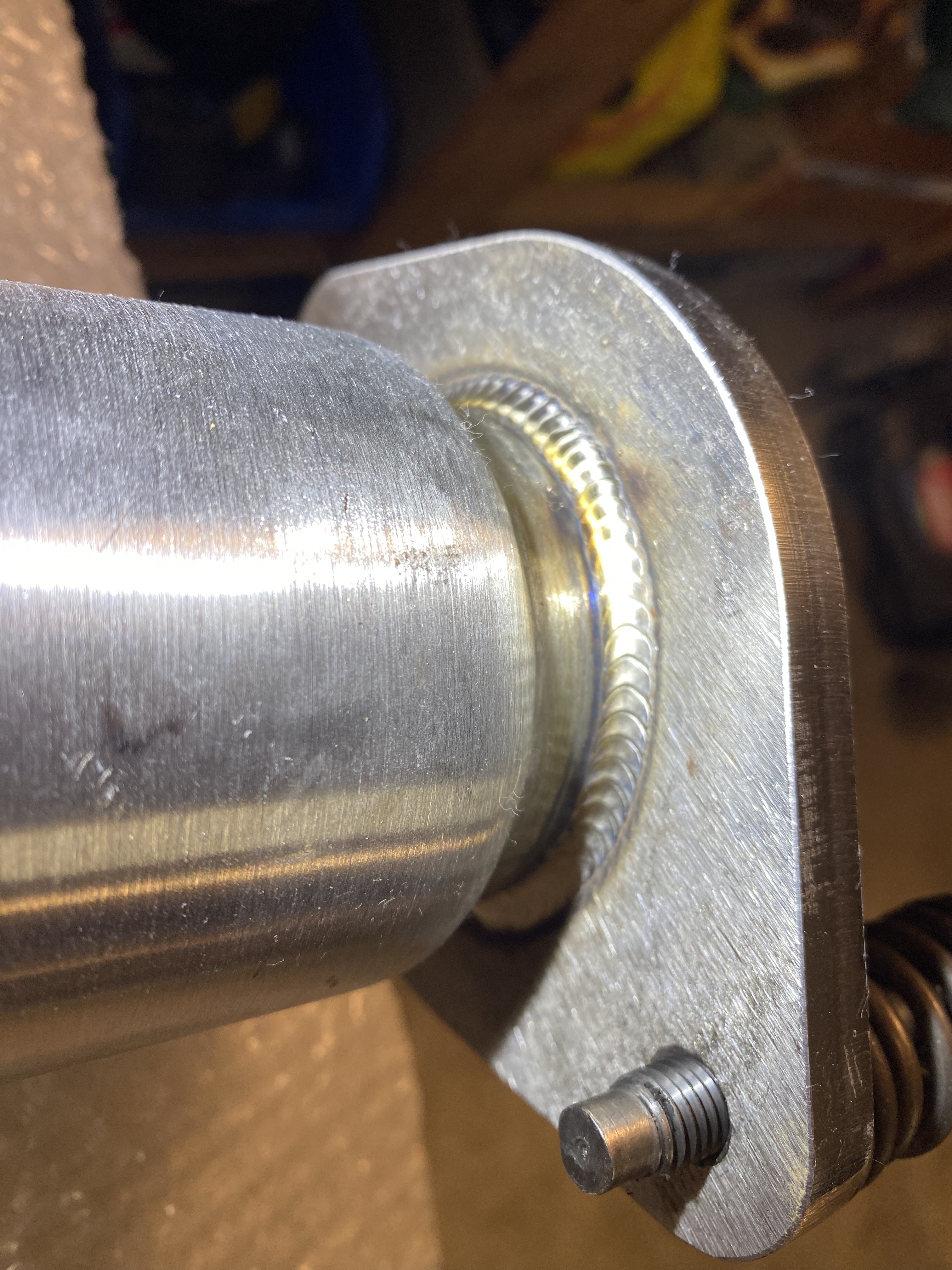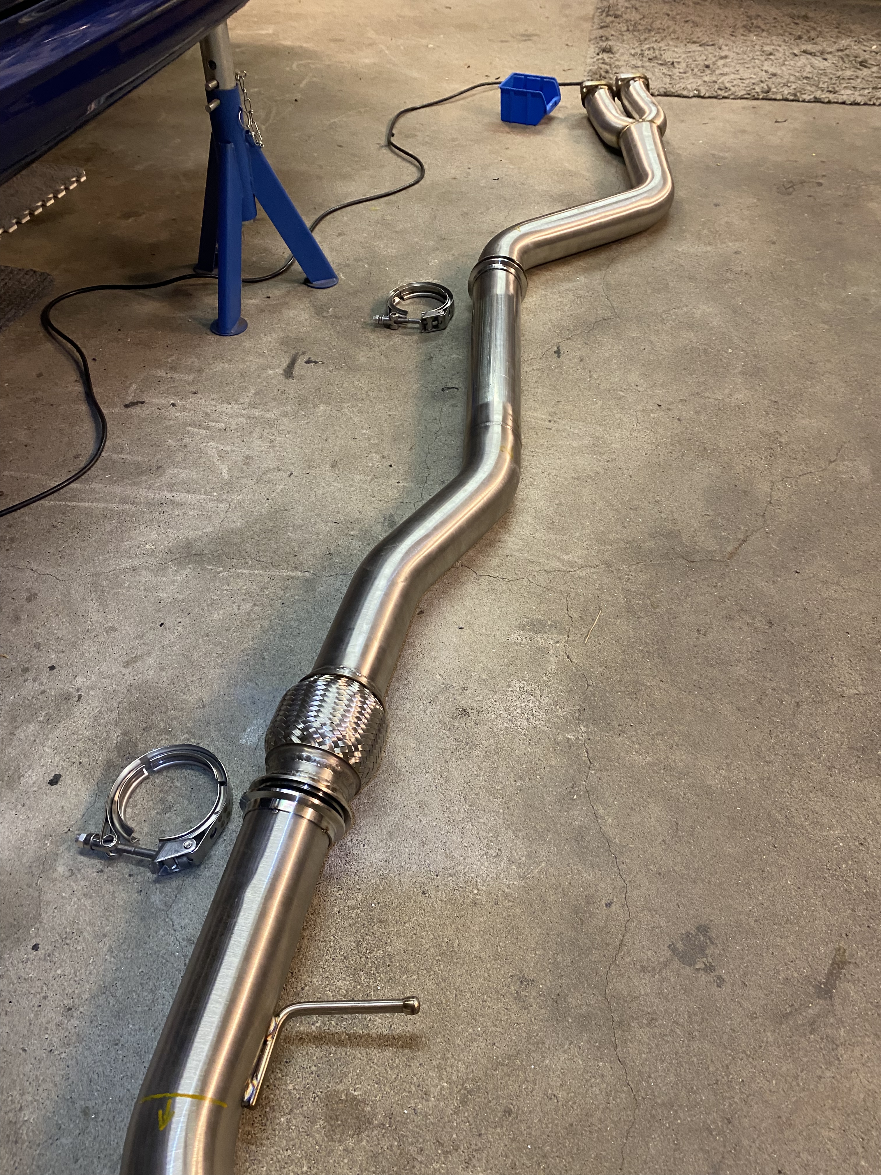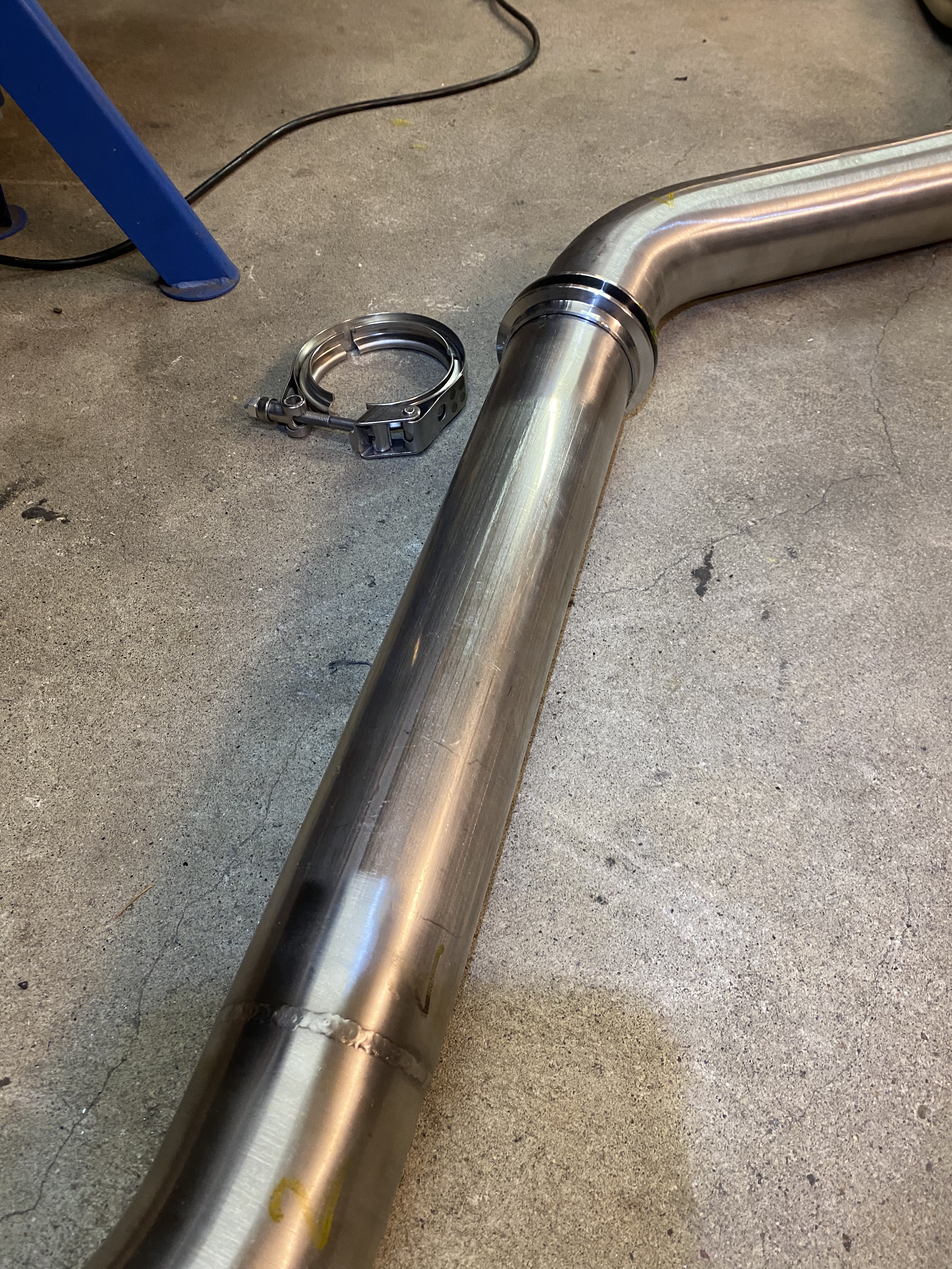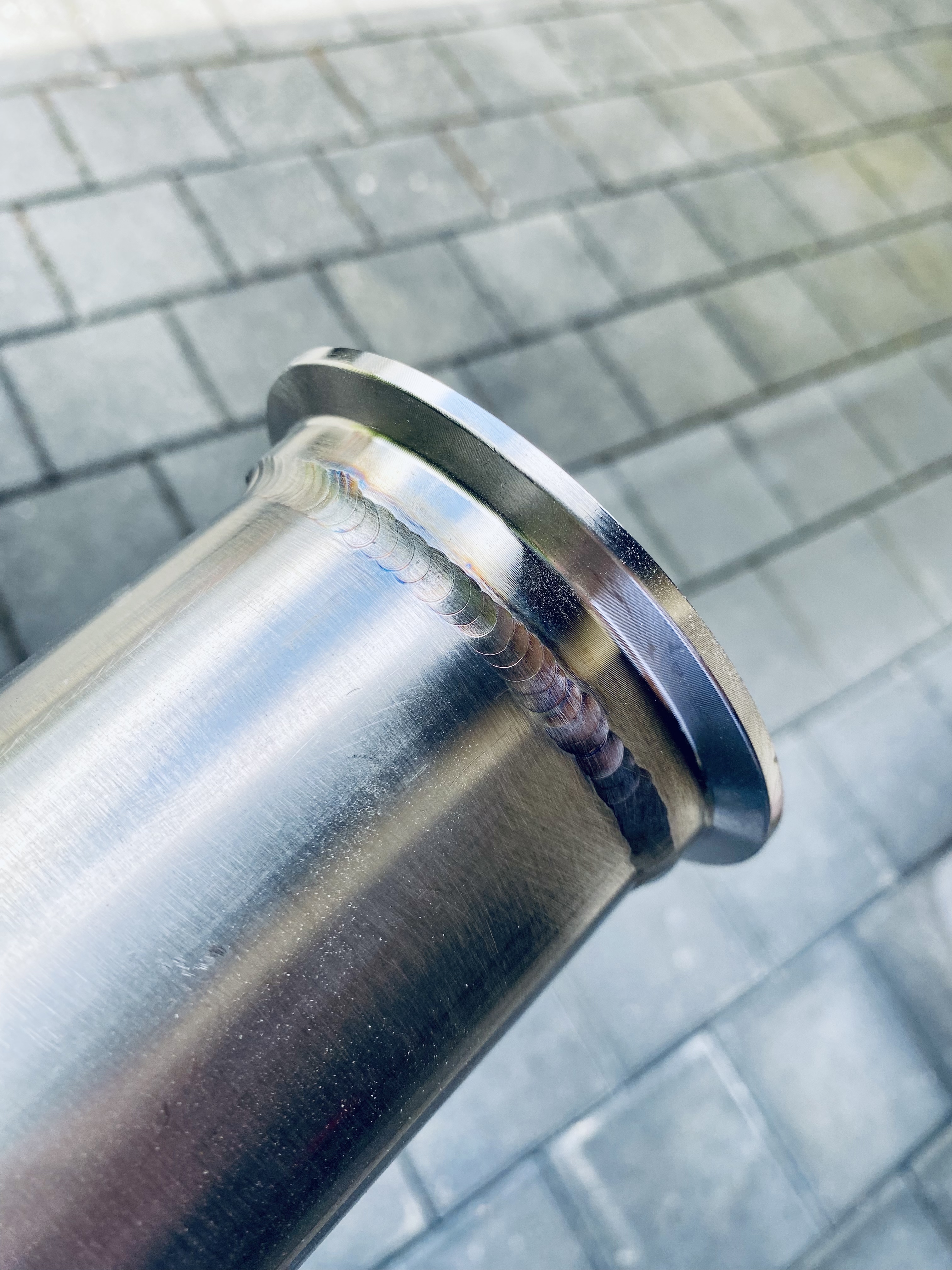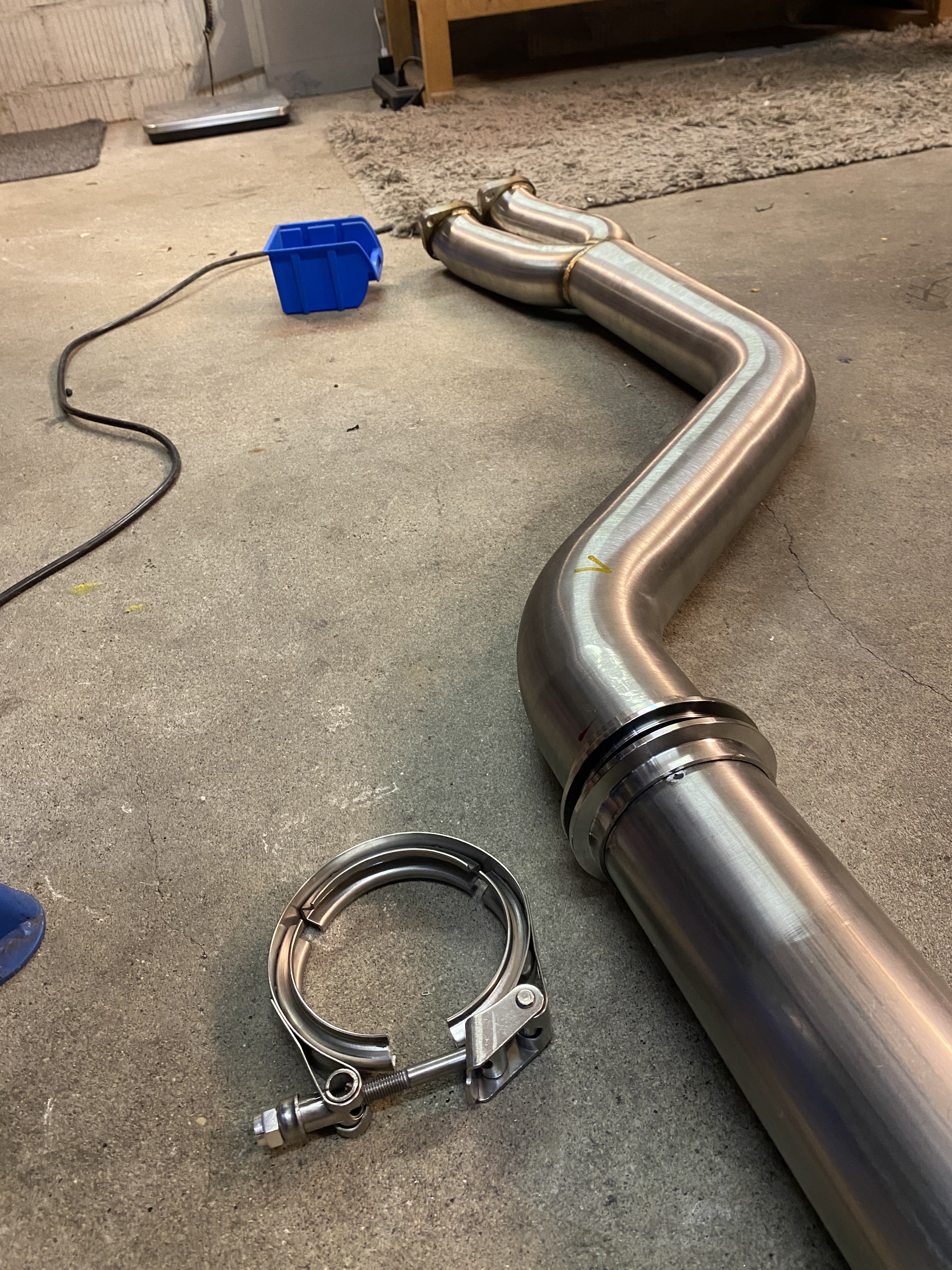 Die Abgasanlage habe ich schrittweise angepasst und die Einzelteile teilweise nur mit Schweisspunkten fixiert, sodass noch Anpassungen vorgenommen werden konnten. Nach diesem schrittweisen Prozess passte die Abgasanlage perfekt 🙂 so sah die Abgasanlage vor dem finalen Durchschweissen aus: