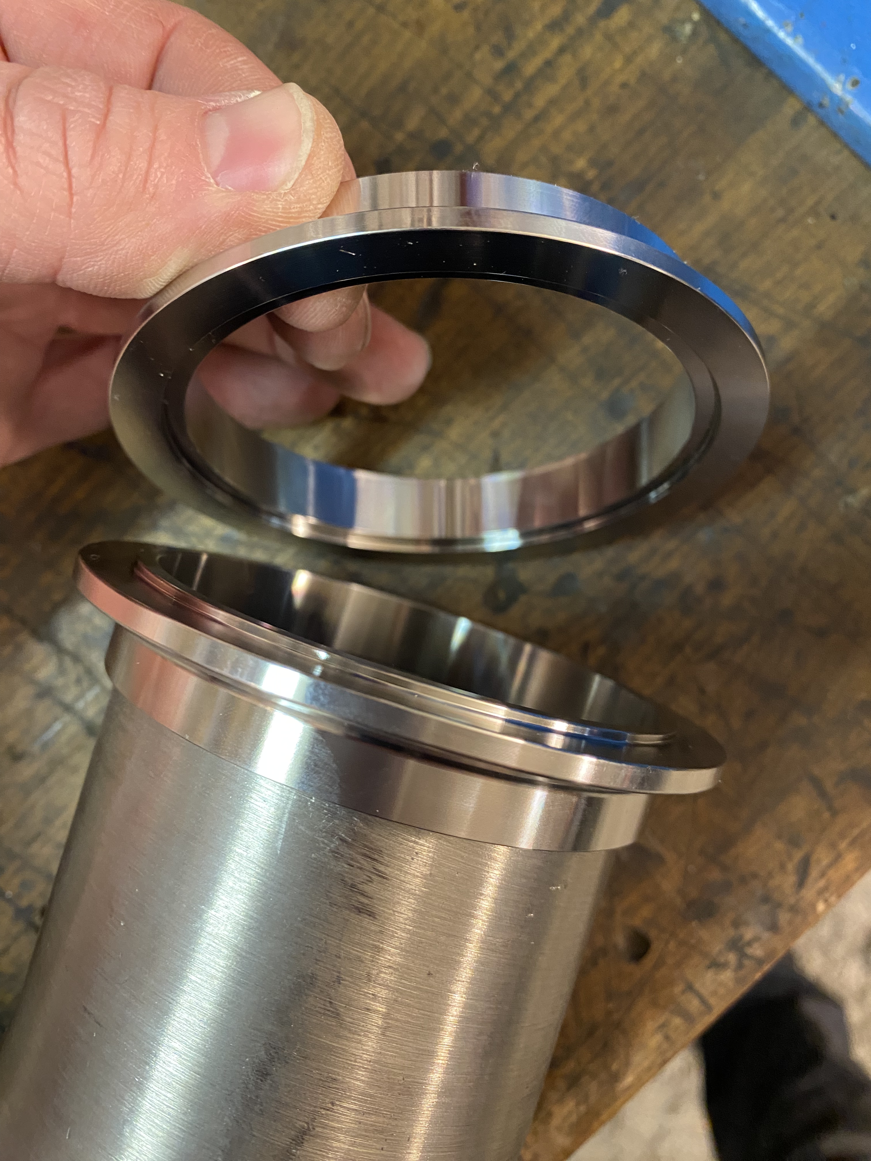 Die VRSF Y-Pipe sowie der Endschalldämpfer passen gut. Das Problem ist der Mittelschalldämpfer, der zu wenig Platz hat. Er steht nicht nur am Mittellager an, sondern auch die Zugstrebe kann nicht mehr vernünftig montiert werden. Aus diesem Grund habe ich entschieden, den Mittelschalldämpfer komplett zu eliminieren. Dazu habe ich mir von Turbozentrum ein gerades Rohr, zwei V-Band-Kits sowie ein Flexrohr gekauft. Natürlich alles in Edelstahl und 76mm Durchmesser. Die Abgasanlage verfügt nach der Modifikation nur noch über einen Endschalldämpfer und wird mit V-Band-Schellen montiert. Durch das Eliminieren des Mittelschalldämpfers passt die Abgasanlage nun gut, ist dank der V-Band-Schellen schnell montiert und ist durchgängig 76mm. Beim Übergang von der mittleren Sektion zum Endschalldämpfer habe ich zudem ein Flexrohr eingesetzt, damit die Abgasanlage etwas „arbeiten“ kann. Die V-Band-Kits von Boost Products passen extrem gut. Das 76mm Rohr fügt sich schön in die dafür ausgefräste Passung ein (perfekt zum Schweissen) und das V-Band-Kit verfügt über ein männliches sowie ein weibliches Gegenstück. Diese greifen exakt ineinander und sind in montiertem Zustand selbstdichtend.