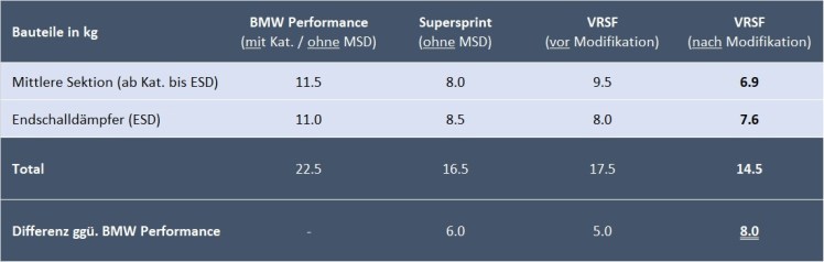 Gewichtstechnisch habe ich auch einiges gewonnen. Gegenüber der Performance Abgasanlage, die ebenfalls kein Mittelschalldämpfer verbaut hatte, habe ich 8kg an Gewicht eingespart. Anbei ein Vergleich der Gewichte, der bis anhin verbauten Abgasanlagen:
