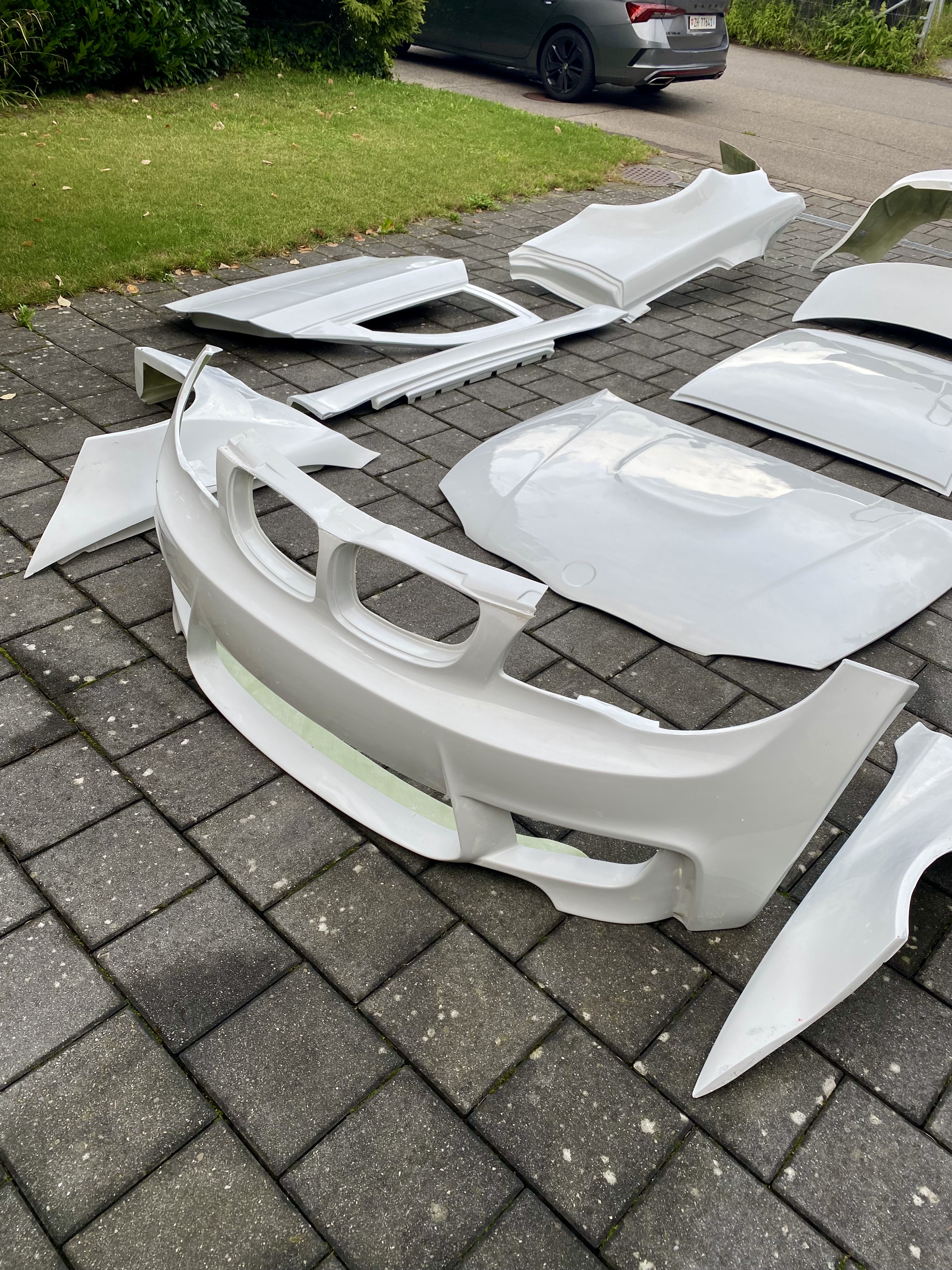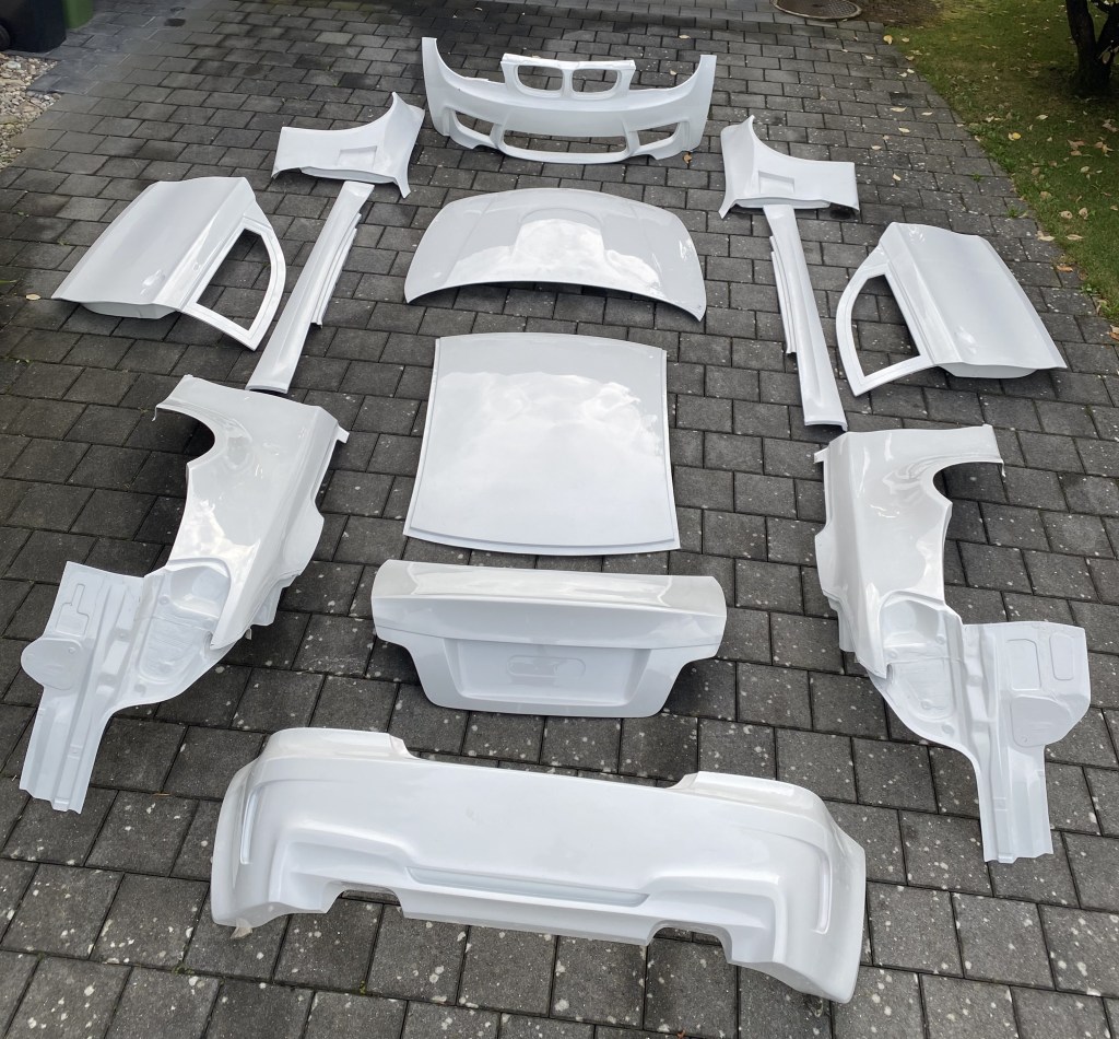 Einerseits ist der E82 135i relativ schmal und andererseits ist das Blechkleid schwer. Um breitere Reifen-Felgen-Kombinationen fahren zu können und weiter Gewicht zu sparen, habe ich mich entschlossen, ein komplettes Bodykit zu verbauen. Ein Kit aus Carbon wäre natürlich die ultimative Lösung, aber das war mir zu teuer. Aus diesem Grund habe ich mir das komplette GFK Bodykit von Mikinka gekauft. Das Preis-Leistungs-Verhältnis ist absolut top! Die Qualität ist super und die Teile sind extrem leicht 🙂 Die hinteren Seitenteile sind in der Dimension vom 1er M. Die Kotflügel sind noch breiter als die vom 1er M. Somit erhoffe ich mir, dass ich im Extremfall ein 295er Square-Setup fahren könnte. Anbei das komplette Bodykit: