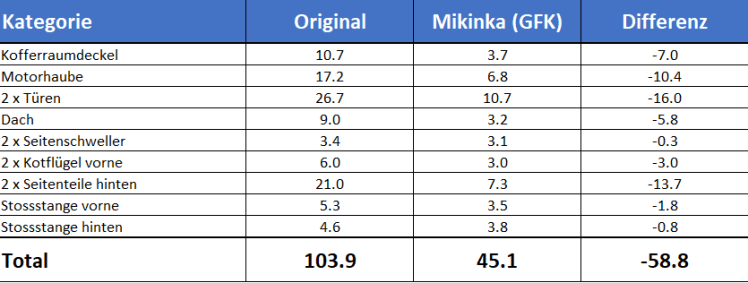 Die Gewichtsersparnis liegt bei insgesamt rund 60kg. Das ist schon sehr beeindruckend, insbesondere da z.B. die Türen schon komplett geschlachtet waren. Das bringt mich gewichtstechnisch definitiv in den Club der 11xx kg Fahrzeuge 🙂 Anbei eine detaillierte Auflistung der Gewichtsersparnisse: